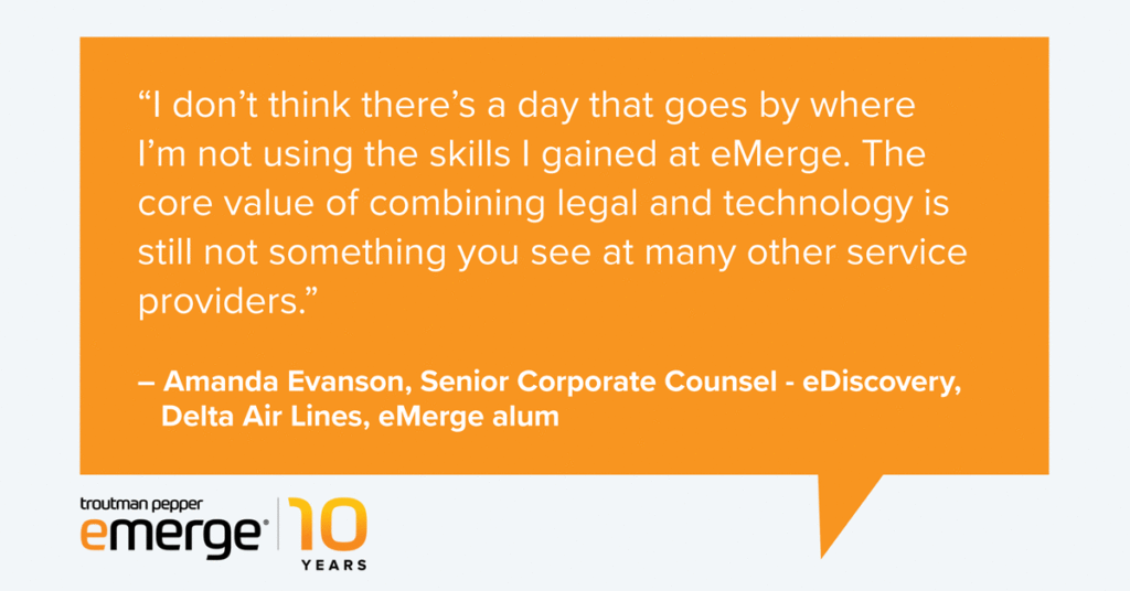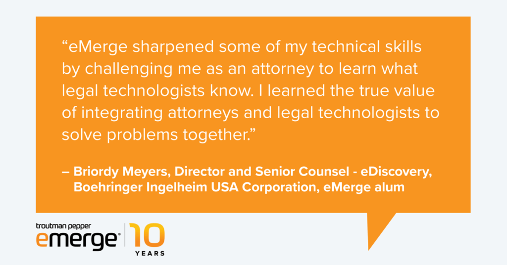Firm’s Legal Technology and eDiscovery Affiliate Reaches Major Milestone this Month Troutman Pepper eMerge, the national law firm’s legal technology and eDiscovery affiliate, celebrates its 10th anniversary this month. The firm subsidiary has grown from a small start-up to an integral part of Troutman Pepper’s client legal strategy. View an interactive site showcasing eMerge’s evolution. […]