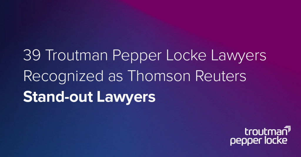 NEW YORK – Thomson Reuters has recognized 39 Troutman Pepper Locke attorneys as “Stand-out Lawyers.” As part of Thomson Reuters’ Sharplegal study, more than 2,000 senior legal buyers around the world are asked to nominate up to three lawyers they have worked with within the last 12 months who have stood out to them above all […]