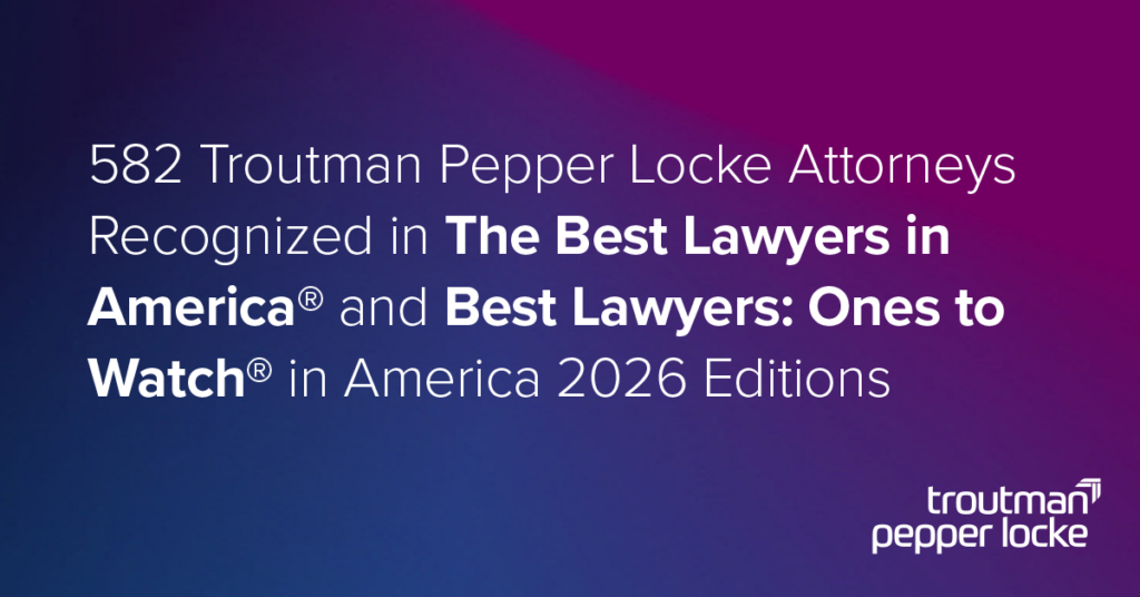 NEW YORK – Troutman Pepper Locke is pleased to announce that 386 attorneys have been recognized in the 2026 edition of The Best Lawyers in America®, and 196 attorneys were recognized in the Best Lawyers: Ones to Watch® in America. In addition, 26 of the firm’s attorneys were recognized under the special designation of “Lawyer of […]